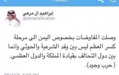 قال الخبير العسكري السعودي إبراهيم آل مرعي ان المفاوضات بخصوص اليمن وصلت الى مرحلة كسر العظم.وأضاف بان المعركة ليست ليس بين وفد الشرعية والحوثي وانما بين دول التحالف بقيادة المملكة والدول