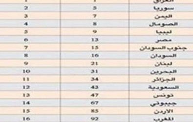 تصدر العراق قائمة تقرير مؤشر الإرهاب العالمي الصادر عن معهد الاقتصاد والسلام، عالمياً وعربياً، وجاءت سوريا في المرتبة الخامسة عالمياً والثانية عربياً، واليمن في المرتبة السابعة عالمياً