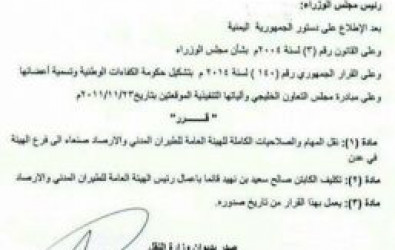 اعلن وزير النقل بدر باسلمة عن نقل هيئة الطيران المدني اليمني من صنعاء الى عدن وتكليف الكابتن