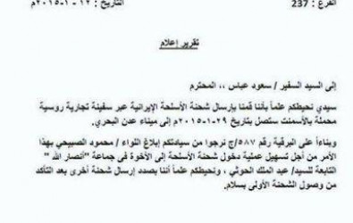 تداول عدد من الناشطين في موقع التواصل الاجتماعي - فيس بوك - وثيقة مسربة حول إرسال الأسد سفينة أسلحة إيرانية إلى الحوثيين فى اليمن .