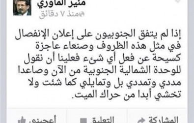 قال الاعلامي اليمني منير المازري في منشور له على صفحته بالفيس بوك :إذا لم يتفق الجنوبيون على إعلان الإنفصال في مثل هذه الظروف وصنعاء عاجزة كسيحة عن فعل أي شئء فعلينا أن نقول للوحدة الشمالية
