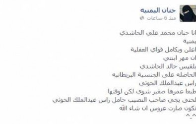 في ظل حرب الحكومة ضد الارهاب بكل طرقة وأشكاله المتنوعة سواء تنظيم القاعدة او تنظيم الحوثي يمنية تعلن وبشكل وثيقة مستخدمة صفحتها على الفيس بوك مقدار المهر التي تطلبه للقبول بزواج ابنتها من اي