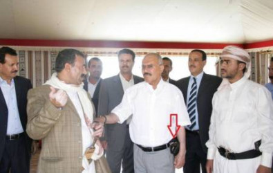 نشر ناشطون صورة للمخلوع علي عبدالله صالح حاملا لسلاحه الشخصي ( مسدس) رغم إحاطته بالعشرات من حرس الحماية الشخصية ونقلت وسائل مقربة من المخلوع ان صالح يخشى من الغدر ولايأمن حتى اقرب الناس إليه