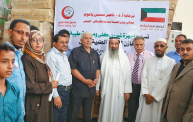 سلم صندوق اعانة المرضى الكويتي في العاصمة المؤقتة عدن صباح اليوم الأحد وزارة الصحة العامة والسكان شحنة من اجهزة الغسيل الكلوي ومعدات طبية اخرى مقدمة من دولة الكويت
