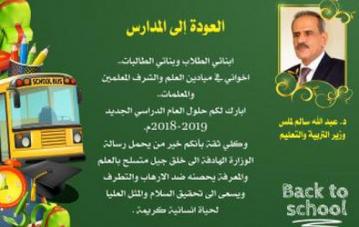 قال معالي وزير التربية والتعليم د. عبد الله سالم لملس: "سينطلق غدا العام الدراسي الجديد 2019/2018م وسيتوافد طلابنا إلى مدارسهم حاملين مشعل العلم نحو المستقبل، ونؤكد لكم أن هذا العام يبدأ في وقت
