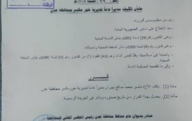 كلف القائم باعمال محافظ محافظة عدن الأستاذ أحمد سالم ربيع "سالمين" الأخ ناصر جبران الجعدني مديرا عاما لمديرية خورمكسر.