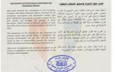 أصدرت إدارة الإعلام في مؤسسة موانئ خليج عدن، بيانا، تناولت من خلاله حيثيات قرار رئيس الجمهورية عبدربه منصور هادي، والذي قضى بتحرير سوق استيراد وتسويق المشتقات النفطية. وجاء في البيان: استقبل
