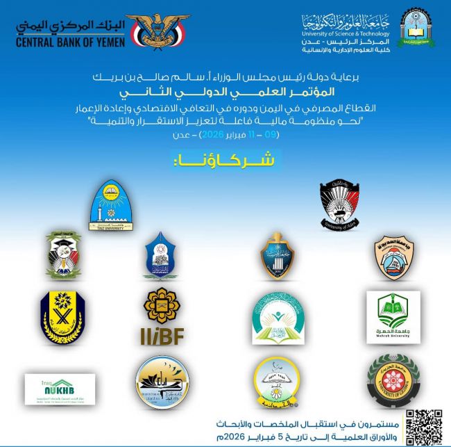 أعلنت جامعة العلوم والتكنولوجيا- المركز الرئيس- عدن، اليمن- ممثلةً بكلية العلوم الإدارية والإنسانية شركاؤها عن تنظيم المؤتمر العلمي الدولي الثاني: "القطاع المصرفي في اليمن ودوره في التعافي الاقتصادي وإعادة الإعمار – 9 – 11 فبراير 2026م- عدن".