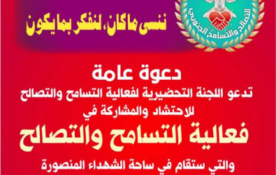 دعت اللجنة التحضيرية لفعالية التصالح والتسامح الجنوبي أبناء الجنوب الى الإحتشاد والتوافد يوم الأربعاء الموافق ١٣ يناير ٢٠٢١ م صوب محافظة عدن لإحياء هذه الذكرى .