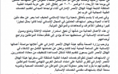 عبرات وزارة الصحة العامة والسكان في العاصمة المؤقتة عدن عن ادانتها بأشد العبارات للعملية الارهابية والحادث الاجرامي الذي استهدف العيادة الطبية المتنقلة التابعة لهيئة الهلال الأحمر