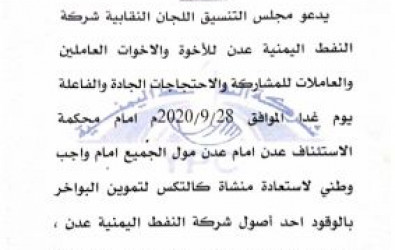 دعى مجلس اللجان النقابية لشركة النفط في العاصمة المؤقتة عدن جميع موظفي الشركة وكافة القطاعات النفطية ومنظمات المجتمع المدني والهيئات الحقوقية وكافة وسائل الإعلام وكل الشرفاء والمواطنين