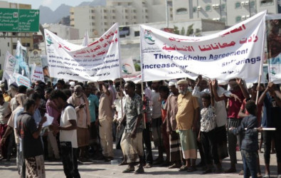 نظم عشرات المواطنين من أبناء محافظة الحديدة اليوم الأحد وقفة احتجاجية أمام مبنى الأمم المتحدة في العاصمة المؤقتة عدن لتنديد بالجرائم والانتهاكات التي تمارسها مليشيا الحوثي بحق