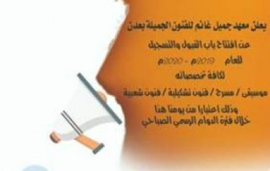 يعلن معهد جميل غانم للفنون الجميلة - عدن عن افتتاح باب القبول والتسجيل للعام الدراسي 2020/2019 في جميع اقسام ( الفنون الموسيقية _الفنون المسرحية_ الفنون التشكيلية _ الفنون الشعبية).