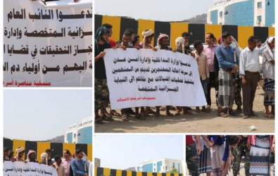 أقام صباح اليوم أولياء دم المجني عليه "سمحان عبدالعزيز الراوي" وقفة احتجاجية أمام المجمع القضائي بمديرية خور مكسر للمطالبة بتسريع عقد جلسات محاكمة المتهمين باغتياله.