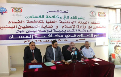 دشنت الهيئة الوطنية لمكافحة الفساد بالتعاون مع وزارة الاعلام ونقابة الصحفيين اليمنيين دورة تدريبية للاعلاميين حول دور الاعلام في مكافحة الفساد.