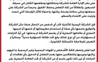 أصدرت الشركة اليمنية للأغذية اعلان تحذيري اثر تعرضها لاعتداء وسطو مسلح من قبل جماعة مسلحة. وحذرت الشركة من انتحال صفة ممثل الشركة والتوقيع باسمها بأي صفة أو استخدام مطبوعاتها أو ختمها أو