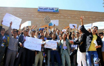 تظاهر طلاب في جامعة صنعاء اليوم الأربعاء للمطالبة بإخلاء الحرم الجامعي من مسلحي الحوثي والمظاهر المسلحة.