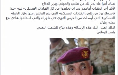 نشر القيادي المؤتمري ياسر اليماني رسالة على صفحته بالفيسبوك وصفها بالعاجلة الى اللواء علي الجائفي حذره من امر يدبره الرئيس هادي ووزير الدفاع كونه حسب اليماني اخر العقبات امام مخطط الاثنيين