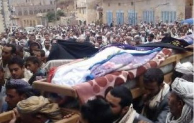 وشيع المحتشدون يحيى محمد الجرادي في مدينة المحويت بعد 10 أيام من استشهاده