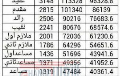 تداول ناشطون في مواقع التواصل الاجتماعي " فيس بوك " اليوم صوره لكشف يوضح بيانات لرتب امنيه وعسكريه " من لواء الى اصغر رتبه وهي جندي " وقرين كل رتبه من تلك الرتب تفاصيل وبيانات رقميه لنسب الزياده
