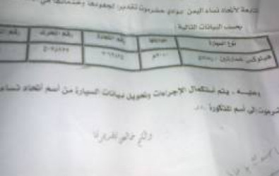 شكت عدد من عضوات اتحاد نساء اليمن بوادي حضرموت,امس الأول,امام وكيل محافظة حضرموت لشئون الوادي والصحراء/سالم سعيد المنهالي,اختفاء سيارة فرع الاتحاد,واختلاسها لاحقاً,حين كانت معهدة الى رئيسة