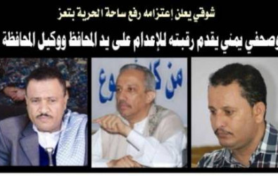 أعلن صحفي يمني استعداده لتقديم رقبته للإعدام على يد محافظ محافظة تعز ووكيل المحافظة محمد منصور الشوافي واشترط قدرة الوكيل على كتابة حكم بإعدامه .وقال في منشور على صفتحه في الفيسبوك ما نصه :