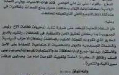 قالت السلطة المحلية بمحافظة عمران ان اوامر الرئيس واضحة في احلال الامن والسكينه في المحافضة محذرة من اي تحرك مسلح او غير مسلح يمكن ان يخل بالامن وحذرت السلطه المحليه المغرر بهم من اي حماقات