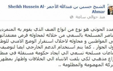 اعتبر الشيخ حسين الأحمر رئيس حزب التضامن الوطني اليوم السبت "أن التمدد الحوثي نوع من أنواع العنف الذي يسعون من خلاله لفرض معتقداتهم على المواطنين واخلال استقرار الوضع الأمني للوطن ودول