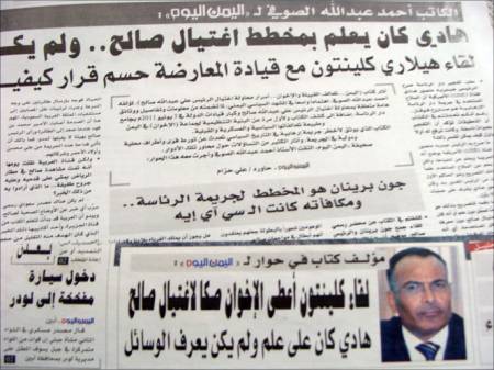 وأشار إلى أن الصوفي قال في حوار لإحدى الفضائيات إن الأميركان أبلغوا صالح بشأن استهدافه لكنه فهم أن الإبلاغ يأتي من باب الضغط عليه لترك السلطة وليس من باب الإخبار الجاد، وخلص إلى القول إن علم هادي بمخطط الاغتيال إن صح، كان كعلم صالح.
