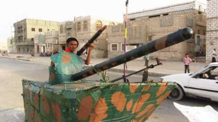 وأظهرت صور في مواقع التواصل الاجتماعي طفلا يقف على مدرعة كرتونية وسط شارع عام.