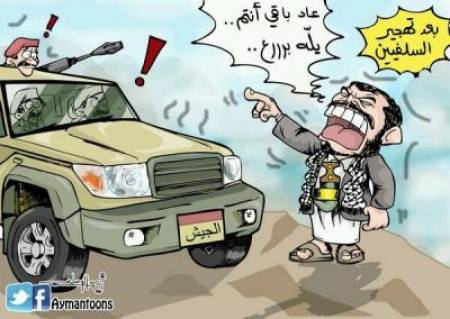 وحول ذلك نشر ناشطون على شبكات التواصل الاجتماعي كاركاتير يظهر فيه السيد بعد تهجير السلفيين من دماج، وكأنه يشير إلى تهجير الجيش.