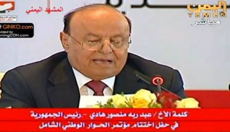 وتحدث هادي عن الوثيقة النهائية لمؤتمر الحوار الوطني وقال إنها تتكون من أكثر من 2000 من المخرجات التي تتوزع بين ما هو دستوري وما هو قانوني، وكلها تخدم مصلحة البلد، حسب قوله.