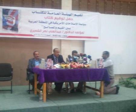 بحضور عدد من السياسيين والأكاديميين والأدباء والمثقفين والشعراء وعدد من الشخصيات والوجاهات الاجتماعية من مختلف الأحزاب والتنظيمات السياسية في اليمن , أقامت الهيئة العامة للكتاب صباح اليوم حفل توقيع كتاب «سياسة الاصلاحات الأمريكية في المنطقة العربية بين القيم والمصالح» للمؤلف الدكتور عبدالغني نصر الشميري.
