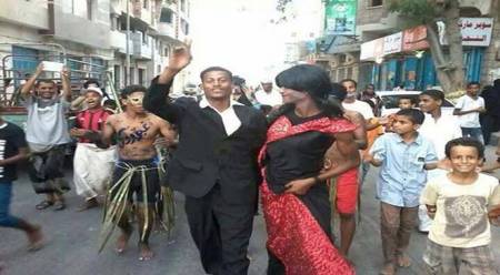 وظهر أحد الشابين يرتدي فستانا بجوار شاب آخر يرتدي بدلة عريس، في مشهد يحاكي حفلات الزواج، وسار الشابان في أحد شوارع المكلا، وسط حشود من المواطنين.