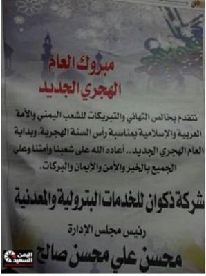 وذيل تهنئته باسم شركة "ذكوان للخدمات البترولية والمعدنية