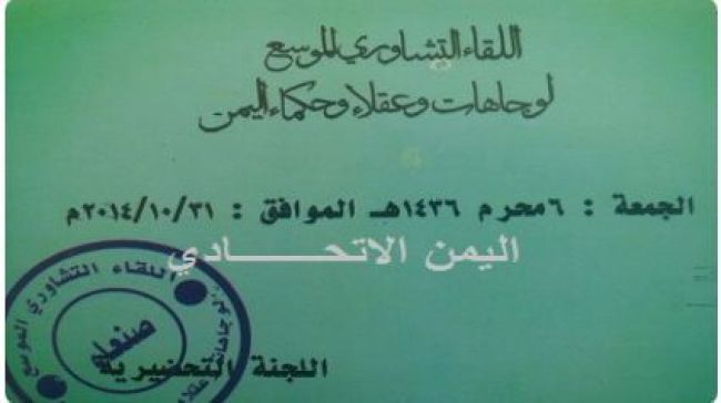 وزعت اللجنة المنظمة للقاء التشاوري الذي دعا الى انعقاده عبدالملك الحوثي نهاية الاسبوع في خطابه الاخير مطلع الاسبوع الحالي - وزعت دعوات مبهمة و مجهولة الهوية والمصدر وزمان ومكان انعقاد اللقاء حسب الاعراف والتقاليد والبروتوكولات المتبعة , ماجعل الكثير من المدعويين يشككون في مصداقية اللجنة المنظمة والجهة الراعية التي لم تحدد زمان ومكان انعقاد اللقاء , ولم تترك رقم تلفون في بطاقات الدعوات للاستفسار , كما جعلهم يتراجعون ويقررون عدم المشاركة في لقاء غير محدد زمانا ومكانا ومجهول التنظيم خشية تعرضهم لخطر مجهول ..