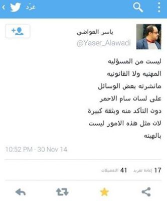 واعتبر العواضي في منشورا على صفحته بموقع التواصل الاجتماعي “تويتر”، اعتبر نشر تلك المعلومات دون التأكد منها وبثقة كبيرة ليست من المسؤولية المهنية ولا القانونية وأردف: لان مثل هذه الامور ليست بالهينة.