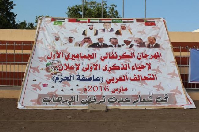 شهدت مدينة عدن عرس كرنفالي بمناسبة مرور عام من التحالف العربي بقيادة خادم الحرمين الشريفين الملك سلمان بن عبدالعزيز ملك المملكة العربية السعودية والشيخ خليفة و محمد بن زايد شيوخ دولة الإمارات العربية المتحدة،وبقية الدول العربية التي شاركت بهذا التحالف الذي هب مبلبياً نصرة إخوانهم في مدينة عدن الباسلة من العدو الغاشم التي شن اعنف هجوم همجي على مدينة عدن.