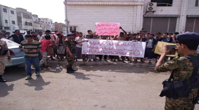 وقفه احتجاجية لافراد كتيبة أمن المنطقة العسكرية الرابعة امام بوابة وزارة المالية بعدن
