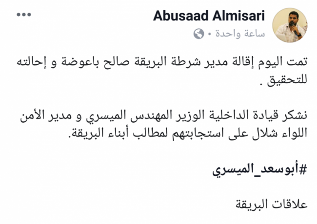 وأضاف،: ” نشكر قيادة الداخلية الوزير المهندس الميسري و مدير الأمن اللواء شلال على استجابتهم لمطالب أبناء البريقة “.