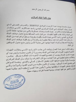 أصدرت نقابة البنك المركزي اليمني بياناً، أدانت فيه ما تعرض له مستشار محافظ البنك المركزي للرقابة والالتزام رشيد الآنسي، من إجراءات تعسفية على يد القوات الأمنية المكلفة بحماية البنك، وبإيعاز من نائب محافظ البنك شكيب حبيشي.