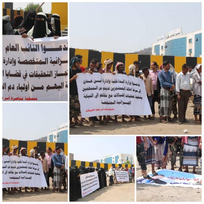 أقام صباح اليوم أولياء دم المجني عليه "سمحان عبدالعزيز الراوي" وقفة احتجاجية أمام المجمع القضائي بمديرية خور مكسر للمطالبة بتسريع عقد جلسات محاكمة المتهمين باغتياله.