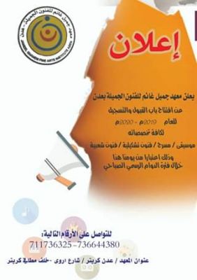 يعلن معهد جميل غانم للفنون الجميلة - عدن عن افتتاح باب القبول والتسجيل للعام الدراسي 2020/2019 في جميع اقسام ( الفنون الموسيقية _الفنون المسرحية_ الفنون التشكيلية _ الفنون الشعبية).