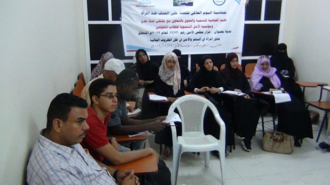 بمناسبة اليوم العالمي للقضاء على العنف ضد المرأة أقيمت اليوم بعدن ندوة لمناقشة وتفعيل قرار مجلس الأمن " 2493" لعام 2019م ، والمتعلق بدور المرأة في السلم والأمن في الظروف الحالية ، نضمتها المفوضية للتنمية والحقوق وبالتعاون مع ملتقى نساء عدن ومؤسسة الامل التنموية للطلاب المتفوقين - عدن .