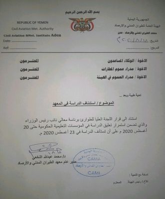 اقر معهد الطيران المدني والارصاد في العاصمة المؤقتة عدن استئناف الدراسة في المعهد بعد اكثر من خمسة اشهر من تعليقها ضمن إطار التدابير الوقائية لمواجهة فيروس كورونا .