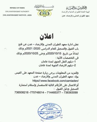 معهد الطيران المدني والارصاد في عدن يعلن عن موعد فتح باب القبول والتسجيل لطالبي شهاده الدبلوم في تخصصي النقل الجوي والارصاد الجوية