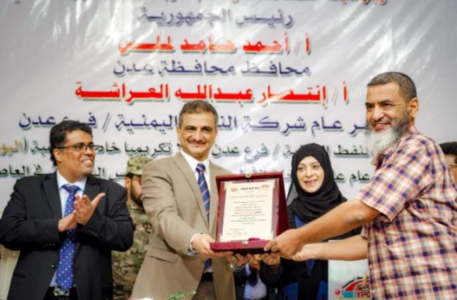 عقب ذلك وبحضور ومشاركة كل من الاخ احمد لملس محافظ عدن والاخت انتصار العراشة مدير عام شركة النفط فرع عدن والمهندس فضل منصور نائب المدير العام للشئون الفنسة والتجارية والمهندس جمال سلوم نائب المدير العام للشئون المالية والادارية ، جرى تسليم الشهادات التقديرية وعدداً من الهدايا للادارات المكرمة بواسطة مدراء تلك الادارات .