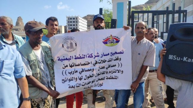 موظفو شركة النفط بعدن يحتجون على تجاوزات شركة المصافي ويطالبون الحكومة بوقفها
