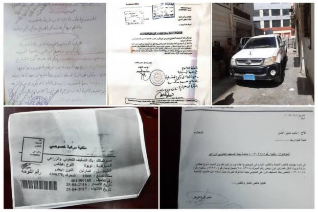عقب العثور واستعادة سيارة كانت بحوزة نجله.. وكيل نيابة يستغل منصبه ونفوذه ضد بنك التسليف بعدن (وثائق)